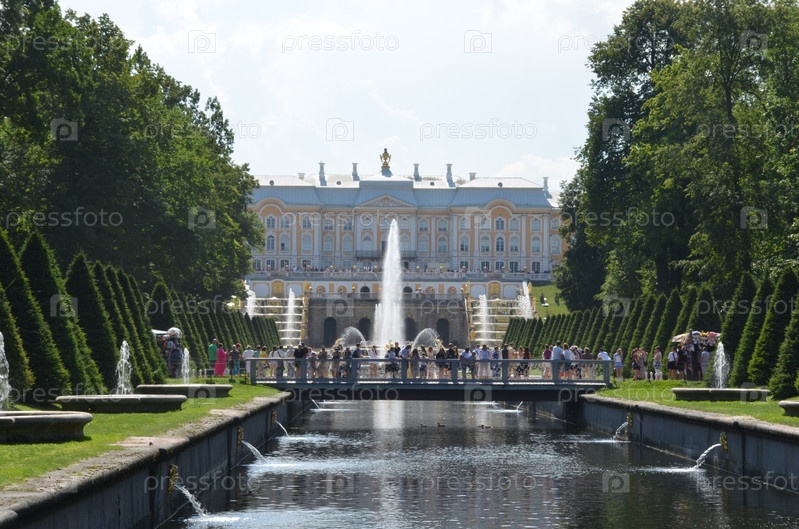 Морской канал, Большой петергофский дворец и Большой фонтанный каскад в Нижнем парке Государственного музея-заповеднига Петергоф в Санкт-Петербурге в ясный летний день