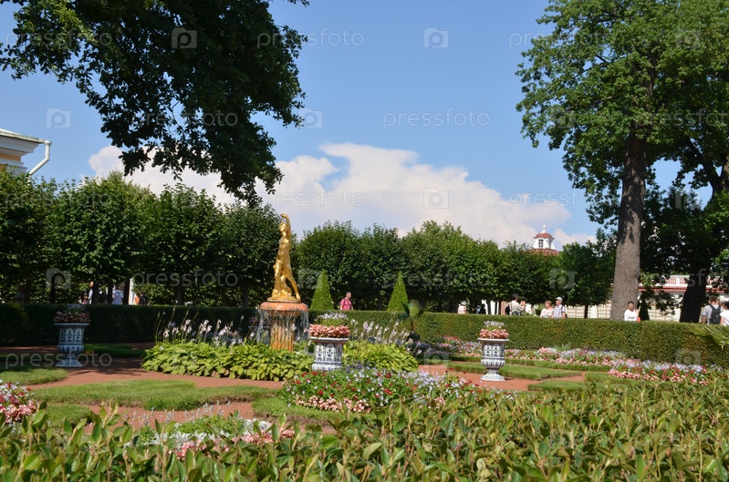 Сад Дворца Монплезир в Нижнем парке Государственного музея-заповедника Петергоф в Санкт-Петербурге: фонтан-колокол со статуей Вакх в ясный летний день