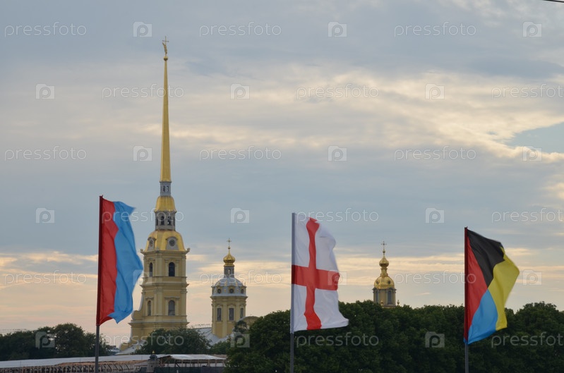 Петропавловская крепость на Заячьем острове в Санкт-Петербурге на фоне флагов украшающих Троицкий мост ко дню Военно-морского флота