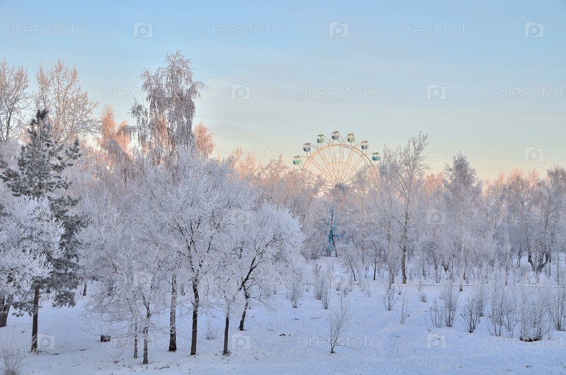 Деревья покрытые инеем в первых лучах солнца