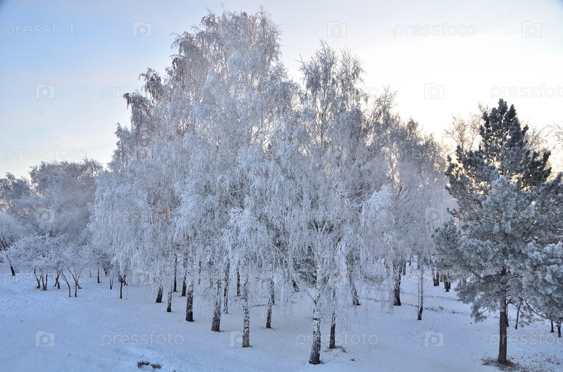 Деревья покрытые инеем в первых лучах солнца