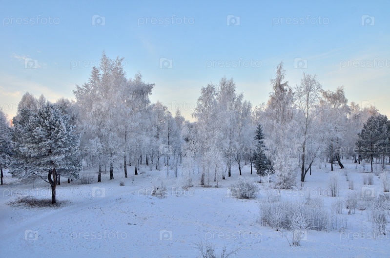 Деревья покрытые инеем в первых лучах солнца