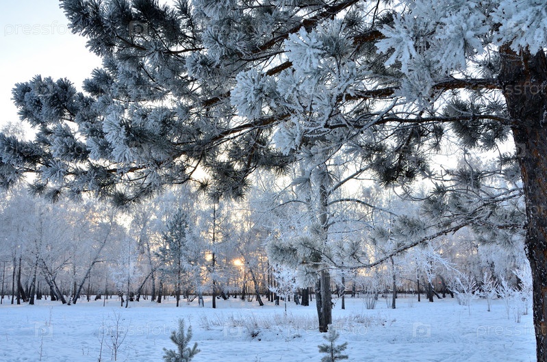 Деревья покрытые инеем в первых лучах солнца