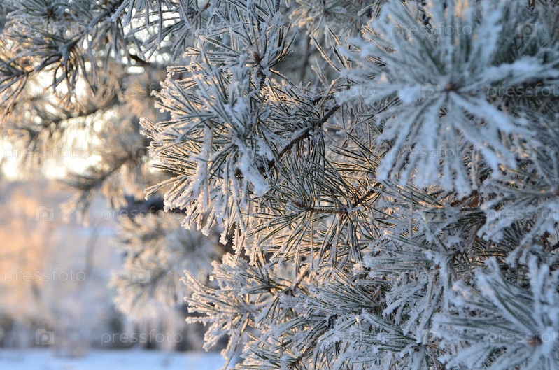 Деревья покрытые инеем в первых лучах солнца
