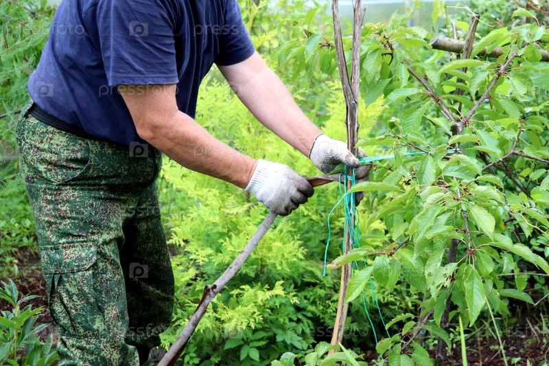 Пожилой мужчина ставит подпорку и подвязывает молодое дерево черешни в саду