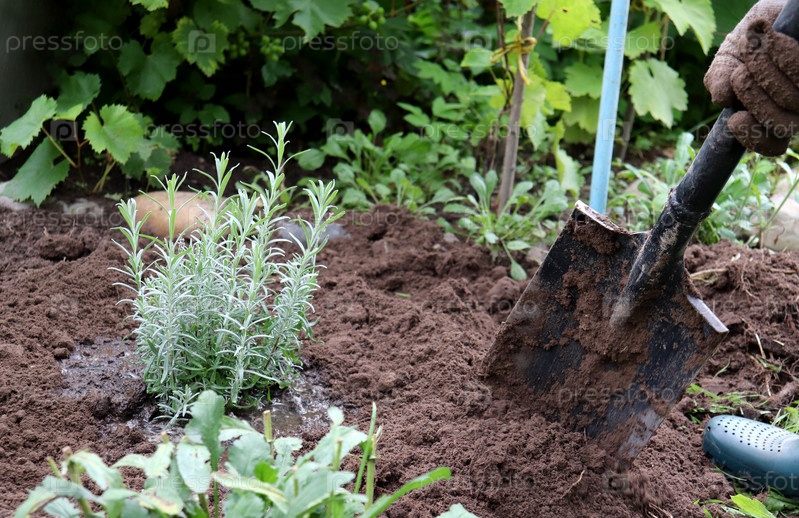 Высаженный куст лаванды в саду, лопата в земле