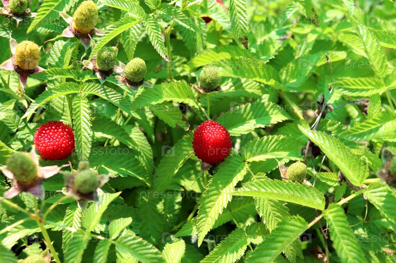 Спелые и незрелые ягоды тибетской малины на кусте в саду