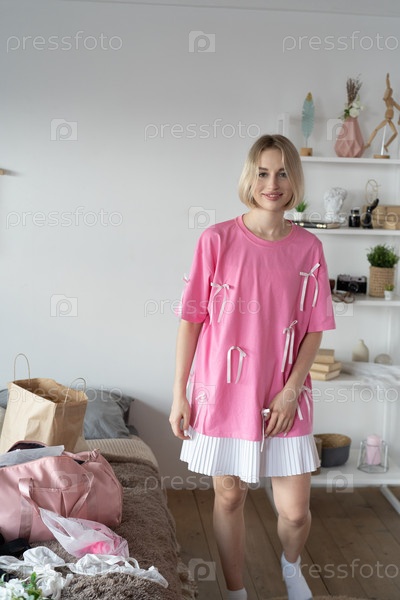 Молодая красивая женщина позирует в розовой футболке в студии