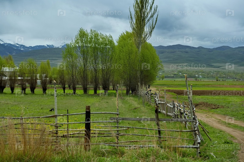 Киргизия. Грунтовая дорога по весенним полям долины вокруг озера Иссык-Куль