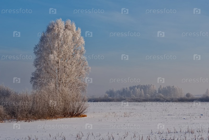 Россия. Юг Западной Сибири, Кузбасс. Зимой деревья, покрытые белым инеем, вдоль дороги в деревню Осиновое Плесо