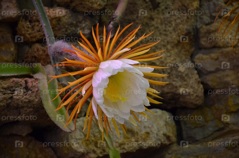 Цветение Селеницереус крупноцветочный (лат. Selenicereus grandiflorus, царица ночи грандифлоры, семья кактусов) в Ботаническом саду Петра Великого, Санкт-Петербург