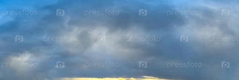 Россия, юг Западной Сибири. Панорамный вид на вечернее небо с закатным солнцем и разноцветными облаками