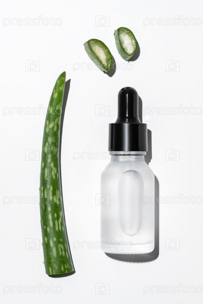 Успокаивающая сыворотка для лица алоэ вера в бутылочке-капельнице и лист алоэ на белом фоне. Натуральная косметика, Мокап