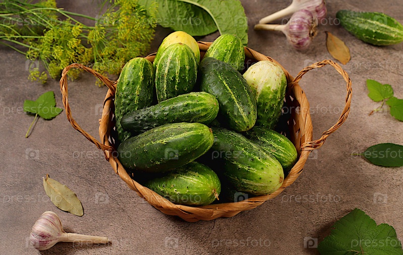 Свежие огурцы в корзине, специи, чеснок и листья на бетонном столе, деревенский урожай, домашний рецепт маринования, огурцы и ингредиенты для маринования, концепция домашнего консервирования