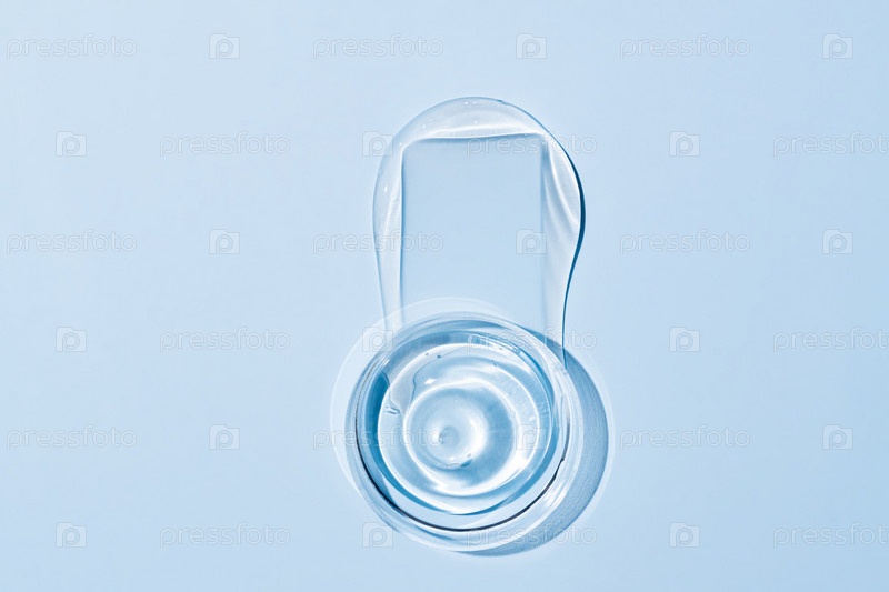 Вид сверху на лабораторную посуду косметического геля и текстуру мазка геля на синем фоне. Косметические образцы экстракта алоэ в чашках Петри