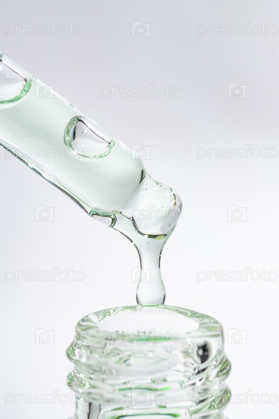 Пипетка для бутылок крупным планом и жидкое зеленое алоэ вера или гель или сыворотка чайного дерева на белом фоне