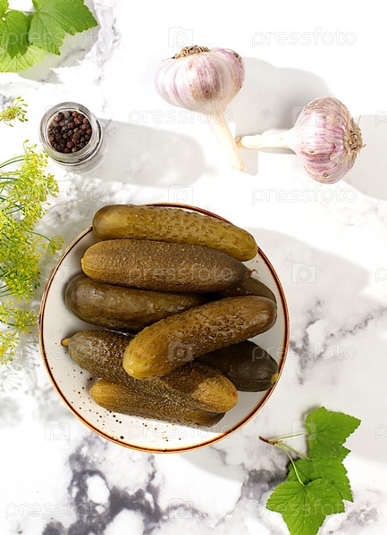 Свежие маринованные огурцы в миске с чесноком и укропом на бетонном столе, деревенский урожай, домашний рецепт маринования, огурцы и ингредиенты для маринования