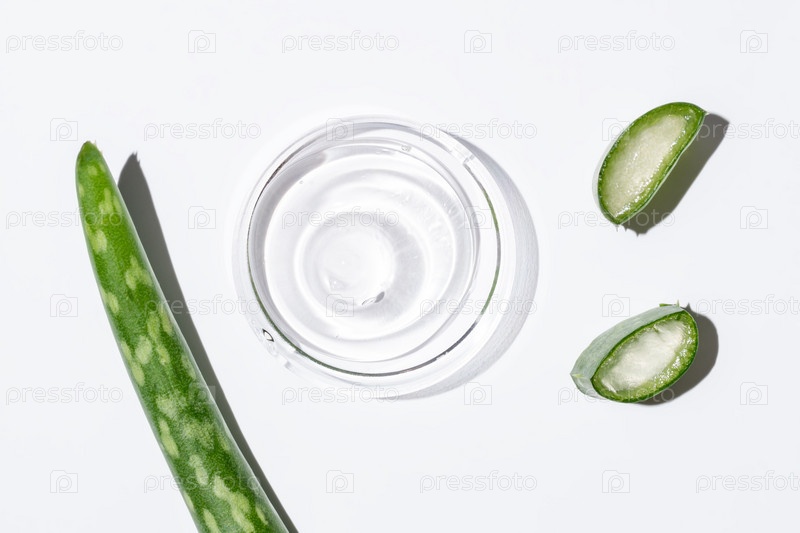 Фотография крупным планом чашки Петри, наполненной гелем алоэ вера и листом алоэ, на белом фоне