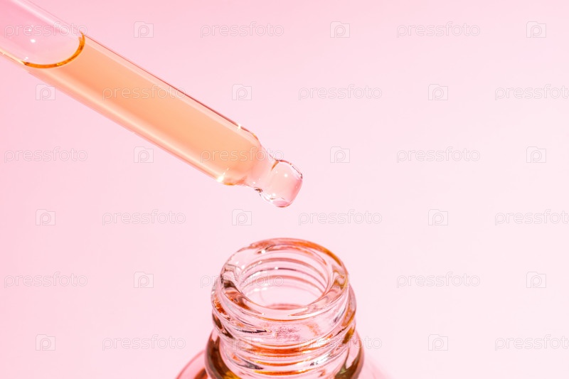 Капля косметического масла падает из пипетки в бутылку из янтарного стекла. Дизайн упаковки косметики по уходу за кожей. Сыворотка с ретинолом или витамином С для поврежденной кожи