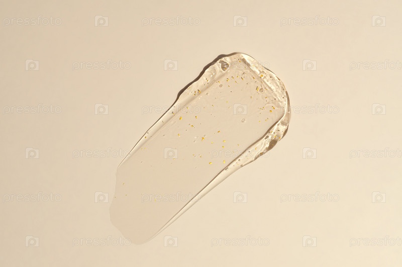 Успокаивающий крем-лосьон, увлажняющий гель из 24-каратного золота с мазками на бежевом фоне. Средство по уходу за кожей и телом. Жидкие гелевые косметические пятна