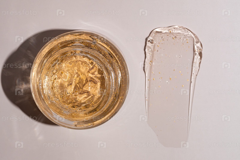 Баночка с прозрачным косметическим продуктом, гелем или кремом из 24-каратного золота на бежевом фоне со мазком, демонстрирующим текстуру. Небрендовая упаковка с антиоксидантным кремом для ухода за собой. Вид сверху