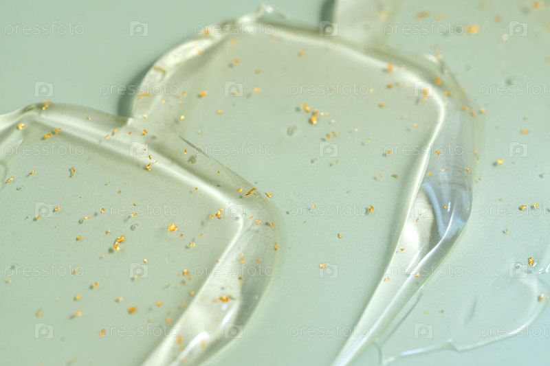 Текстура гиалуроновой кислоты с 24-каратным золотом, сывороточного геля. Прозрачный мазок геля выделен на зеленом фоне. Крупный план, макро