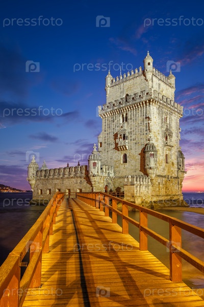 Башня Белен или Башня Святого Винсента - известная туристическая достопримечательность Лиссабона и туристическая достопримечательность - на берегу реки Тежу (Тежу) после захода солнца в сумерках с драматическим небом. Лиссабон, Португалия