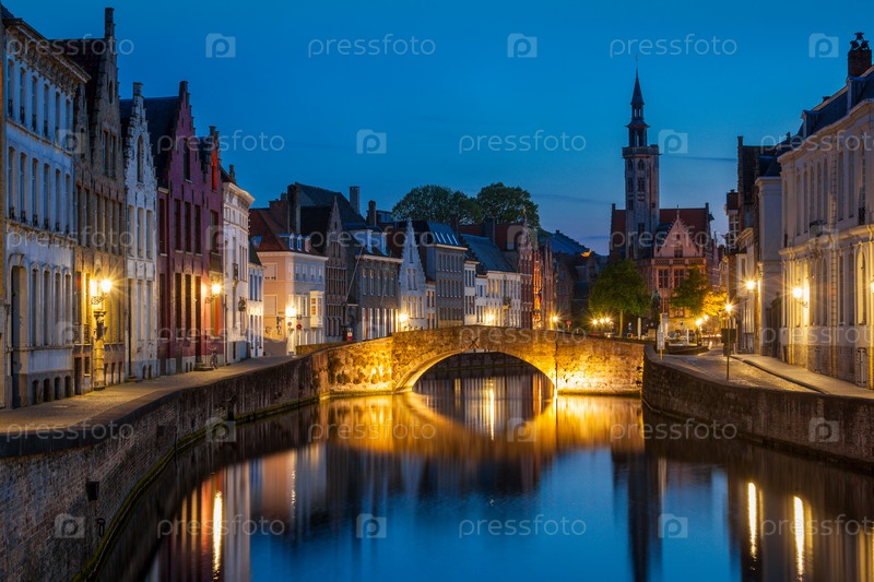 Европейский средневековый ночной вид на город - канал Брюгге (Брюгге) вечером, Бельгия