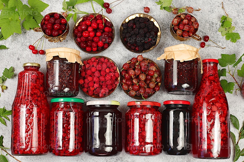 Банки с малиновым, вишневым, крыжовниковым вареньем и компотом на светлом фоне с листьями и свежими ягодами, концепция домашнего консервирования, баннер и реклама магазина и рынка, деревенский урожай,