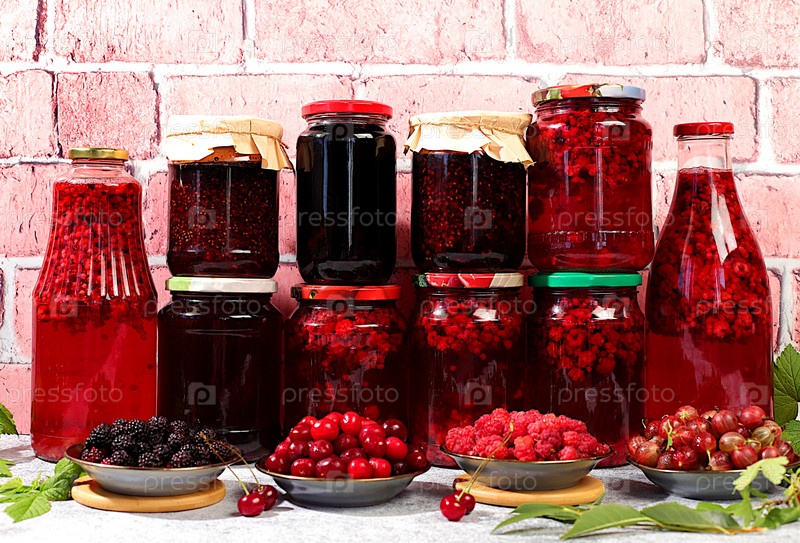 Банки с малиновым, вишневым, крыжовниковым вареньем и компотом на кухонном фоне с листьями и свежими ягодами, концепция домашнего консервирования, баннер и реклама магазина и рынка, деревенский урожай,