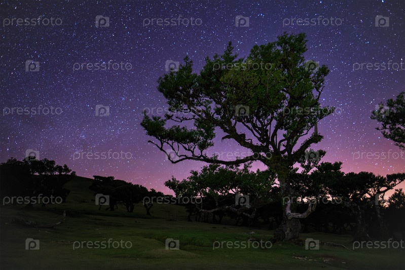Лесные деревья Фанал на острове Мадейра ночью со звездным небом, Португалия