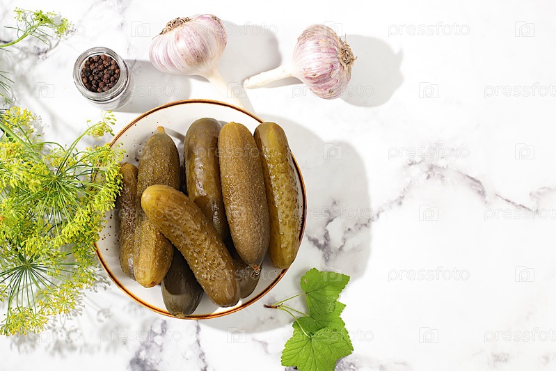 Свежие маринованные огурцы в миске с чесноком и укропом на бетонном столе, деревенский урожай, домашний рецепт маринования, огурцы и ингредиенты для маринования,