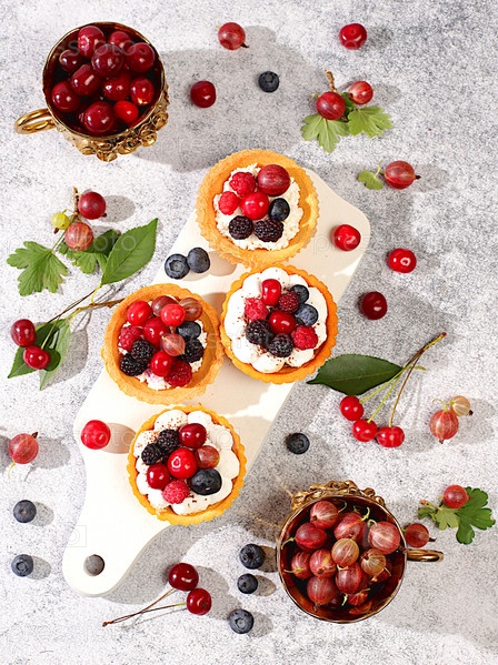 Вкусные тарталетки со свежими ягодами малины, вишни, крыжовника и черники. Кексы с мягким творожным кремом, летний десерт. Концепция современной пекарни, реклама кафе, ресторана, меню