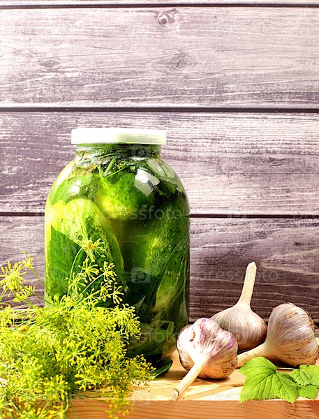 Маринованные огурцы в банке с чесноком и укропом на деревянном кухонном столе, деревенский урожай, домашний рецепт маринования, огурцы и ингредиенты для маринования