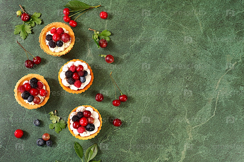 Капкейки с нежным творожным кремом, Вкусные тарталетки со свежими ягодами малины, вишни, крыжовника и черники. Летний десерт. Концепция современной пекарни, реклама кафе, ресторана, меню