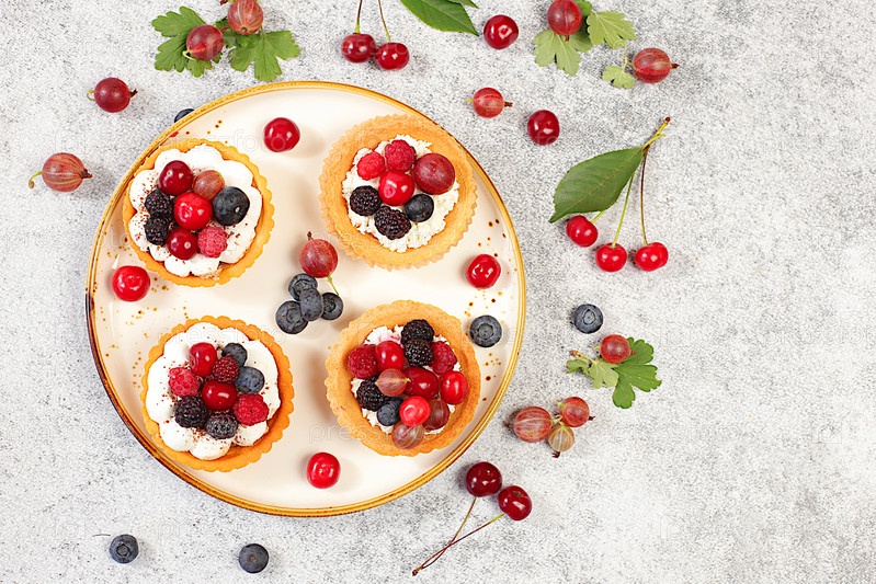 Вкусные тарталетки со свежими ягодами малины, вишни, крыжовника и черники. Кексы с мягким творожным кремом, летний десерт. Концепция современной пекарни, реклама кафе, ресторана, меню