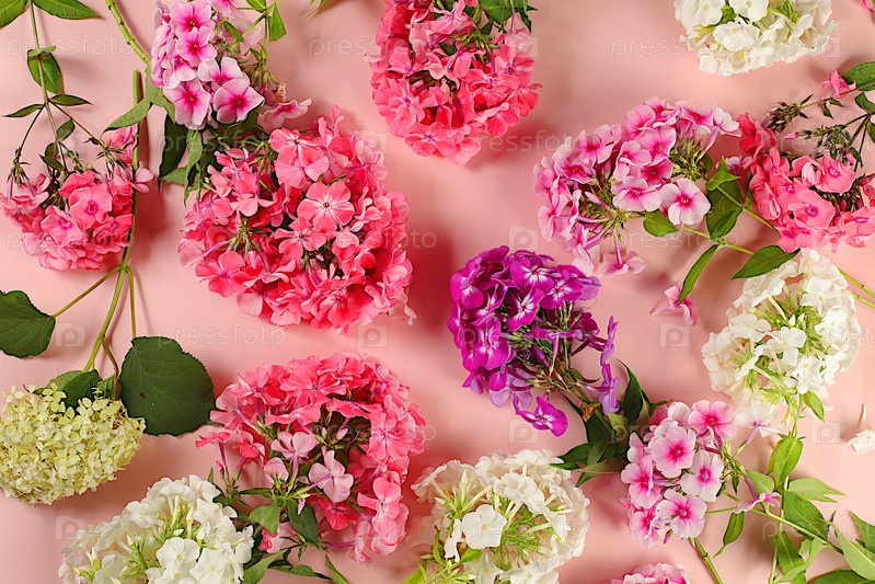 Красивые цветы флокса на светлом фоне, летний и осенний рекламный баннер продукта, абстрактная плоская цветочная композиция, деревенский стиль, праздничная открытка,