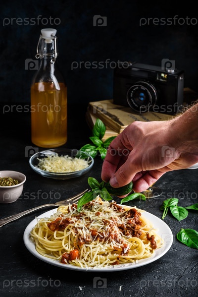 Спагетти с соусом болоньезе и тертым сыром пармезан