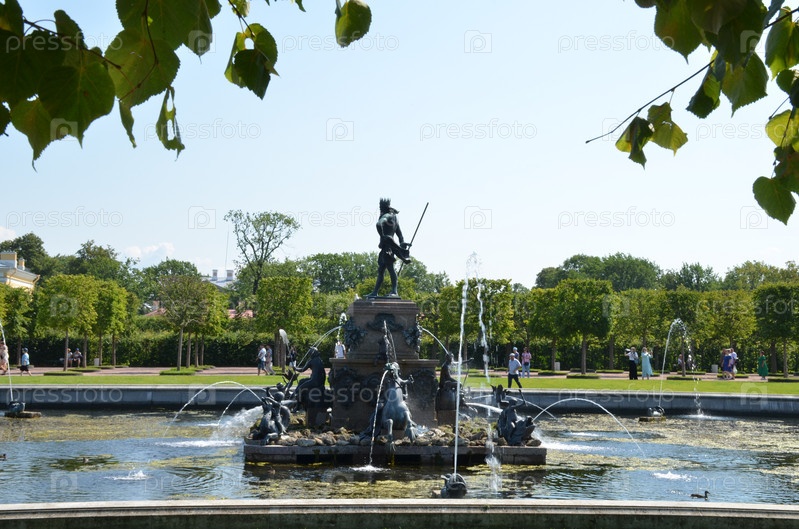 Верхний сад Государственного музея-заповедника Петергоф в Санкт-Петербурге: фонтан Нептун в ясный летний день