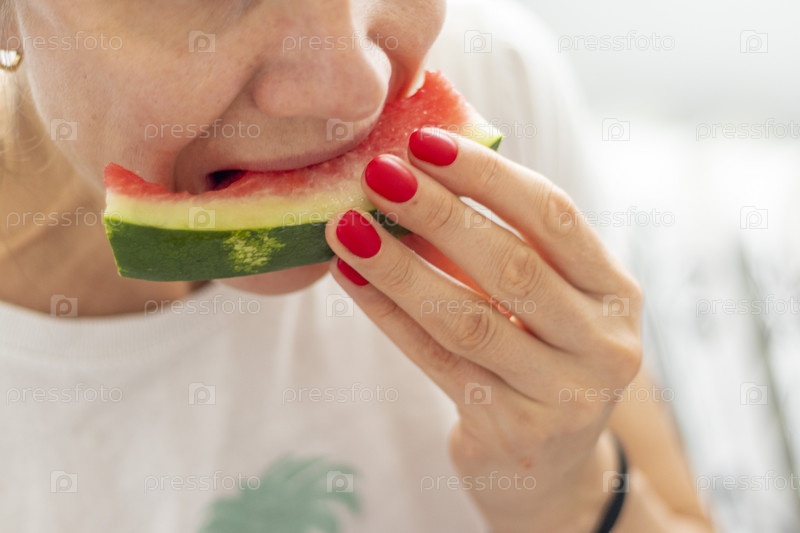 Кадр с женщиной, которая ест арбуз. Еда
