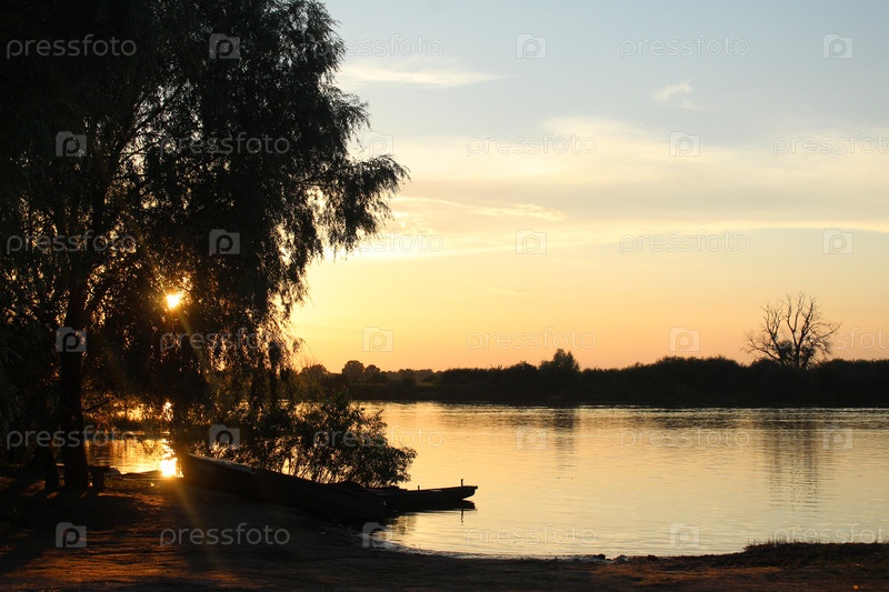 Восход солнца над рекой с черными силуэтами лодок. Желтый Синий Черный Вечерний пейзаж заката