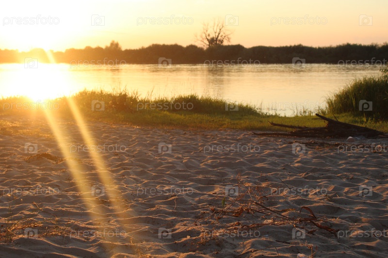 Рассвет на пляже у воды. Вечерний пляж у воды реки, озеро, закат на пляже