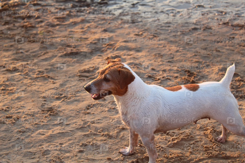 Собака породы Джек Рассел белая с коричневыми пятнами на пляже на закате. Пляжный отдых с домашними животными