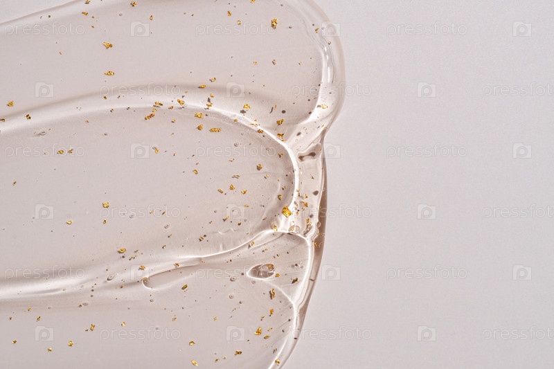 Прозрачный коллагеновый косметический гель против старения сыворотки с золотыми частицами, текстура масла на бежевом фоне с копировальным пространством. Увлажняющий продукт для ухода за кожей с гиалуроновой кислотой и пузырьковым макросом