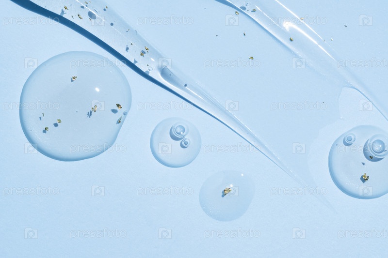 Жидкий гель из 24-каратного золота на синем фоне. Косметические пятна, такие как чистый прозрачный лосьон алоэ, желеобразная сыворотка для лица, очищающее средство, гель для душа или шампунь, вид сверху