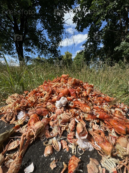 Гора отходов речных раков. Клешни и панцири после еды. Отходы фона