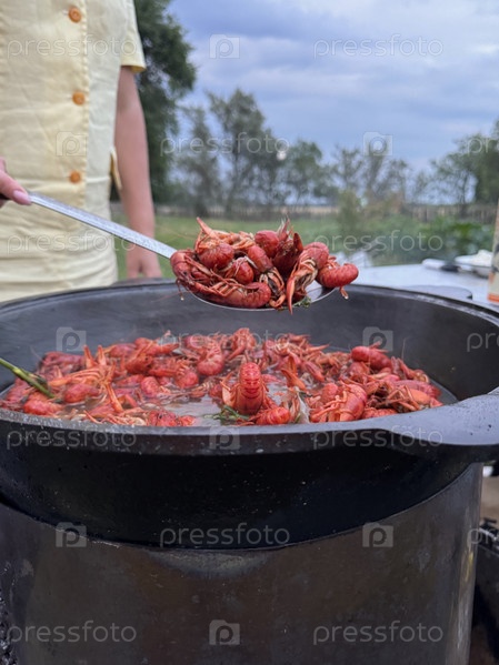 Шеф-повар перемешивает речных раков в кипящей воде шумовкой. Раки стали красными