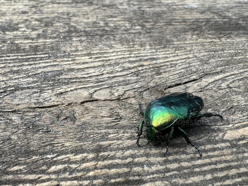 Золотой бронзовый жук. На состаренной деревянной поверхности. Крупный план