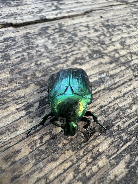 Золотой бронзовый жук. На состаренной деревянной поверхности. Крупный план
