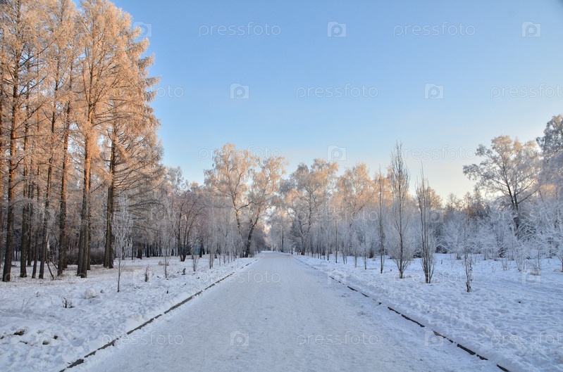 Деревья покрытые инеем в первых лучах солнца